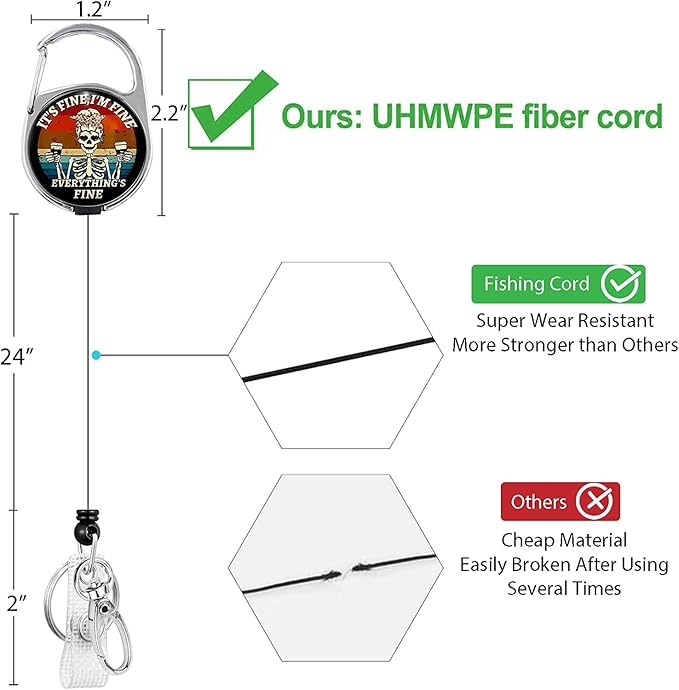 - Novelty Badge Reel: This skull badge reel is designed with funny arts:It's Fine I'm Fine Everything's Fine. The cute and interesting badge reel will always bring more happiness and fun to your life. You will get tons of comments on it