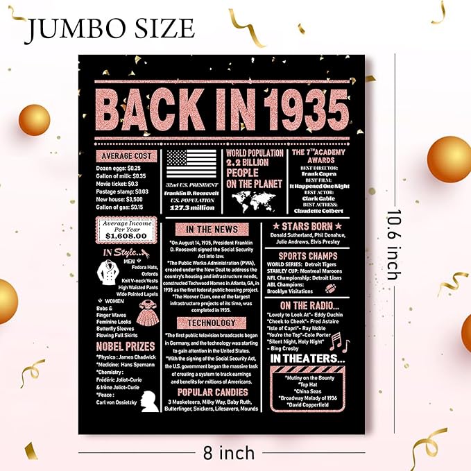 90th Birthday Card, 90th Birthday Decorations for Women, 90th Birthday Gifts for Grandma, Back in 1935 Birthday Card, Rose Gold