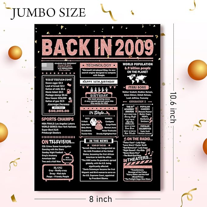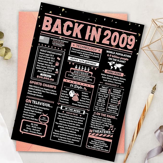 16th Birthday Card, 16th Birthday Decorations for Girls, 16th Birthday Gifts for Daughter, Back in 2009 Birthday Card, Rose Gold