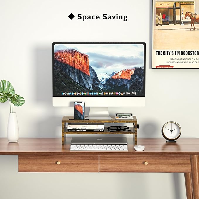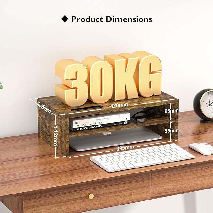 - 【MONITOR RISER STAND WITH STORAGE ORGANIZER】Our wooden monitor stand for desk comes with cable management slots that can make your cord stay organized. Cell phone holder will free your hands to make work easier. The monitor shelf provides enough area for storing laptops, keyboards, wireless mice, and daily necessities to keep your desktop tidy.