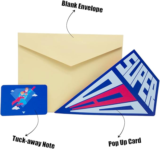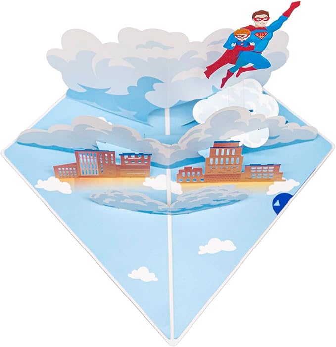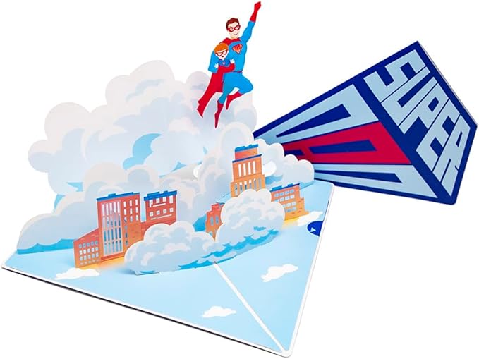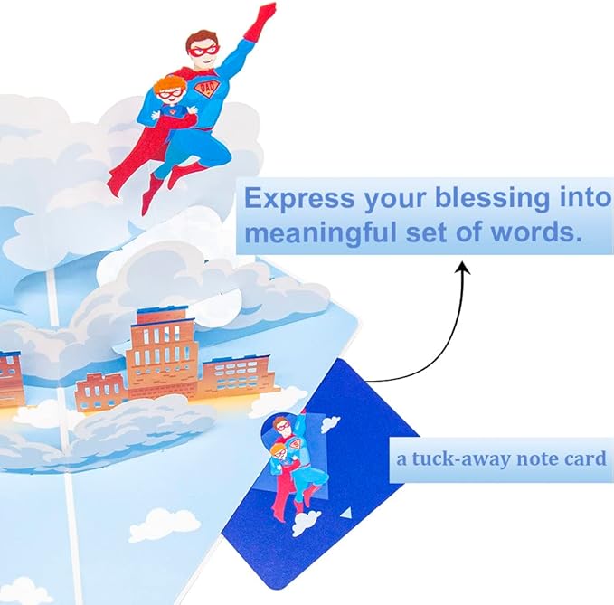 - [GORGEOUS DESIGN] When folded, this super dad 3D pop up card has a distinctive design. Upon opening, a flying super dad soars up to the sky with the child in his arms unexpectedly pop right off the page that definitely surprise your loved one. The popup card is a great way to show your dad how much he means to you and no matter how old he is, he will always be your superhero.