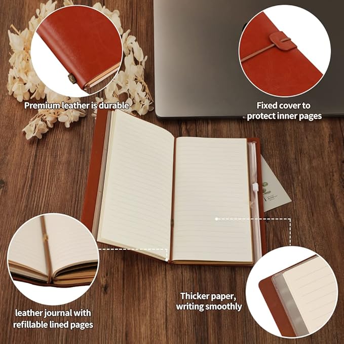 - 【Refillable Design】There are two different papers in the diary, liner + kraft paper, a total of 140 pages. Includes PVC card slot and a pouch inside. The double-line binding design allows the paper inside to be replaced at will, increasing reusability. A stretchy leather cord secures the entirety of the notebook on the outside of the notepad.