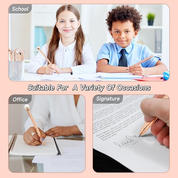 - 【Rose Gold Ballpoint Pen Set】 Set of 6 rose gold ballpoint pens design for different styles. It includes a diamond pen, a heart shaped diamond pen, a pearl pen, a heart shaped metal pen, a glitter pen and a stylus pen .The variegated design can satisfy your difference usage scenarios and demands.
