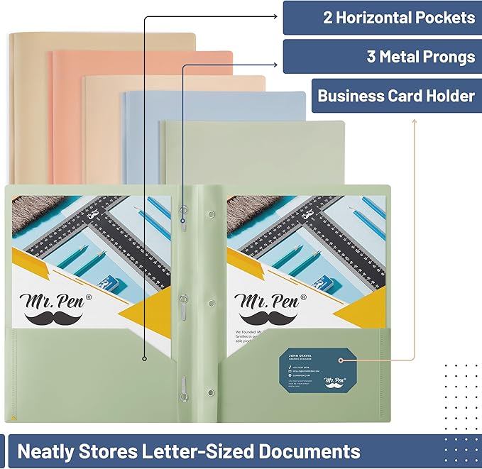 Mr. Pen- Plastic Folders with Pockets and Prong, 5 Pack, Vintage Colors, Pocket Folders, Folders with Prongs, File Folders with Fasteners, 2 Pocket Folder, Folder with Pockets, Two Pocket Folder