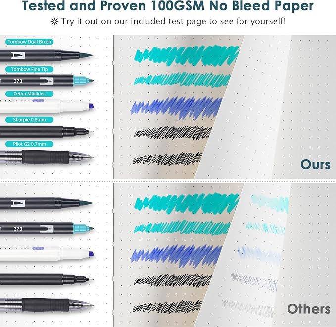 - 【Thick Paper for Writing Without Limits】Large A4 hardcover notebook (8.5'' × 11''/216mm x 283mm), total 320 pages, includes 312 numbered pages(156 sheets). Each page includes 2255 dots with 5mm spacing: X41*Y55. Our INNOVATIVE PAPER TECHNOLOGY on 100GSM thick paper ensures a perfect canvas for your ideas - no bleed, no ghosting, as confirmed by tests with various pens commonly used in bullet journaling.