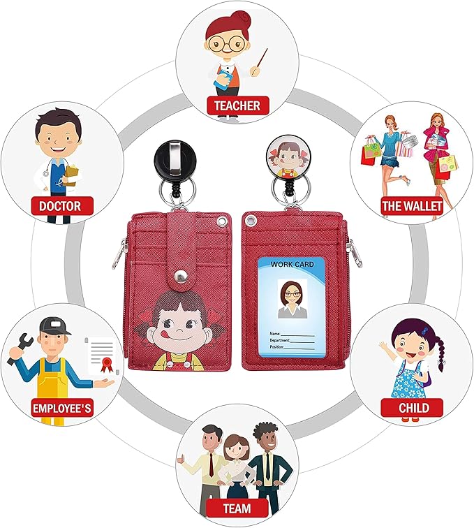 Cute ID Badge Holder Retractable Lanyard Reel Clip with Heavy Duty Carabiner, 5 Card Slots in 2 Sided with Key Ring and Zipper for Women Students Teens Girls Office Staff (Red Girl)