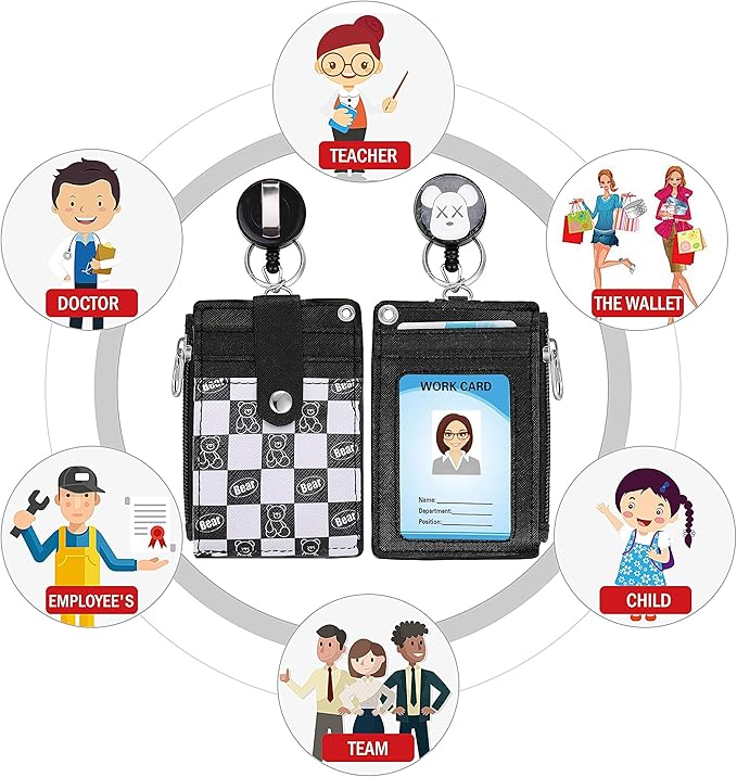 Cute ID Badge Holder Retractable Lanyard Reel Clip with Heavy Duty Carabiner,5Card Slots in 2 Sided with Key Ring and Zipper for Women Students Teens Girls Office Staff (Black White Bear)
