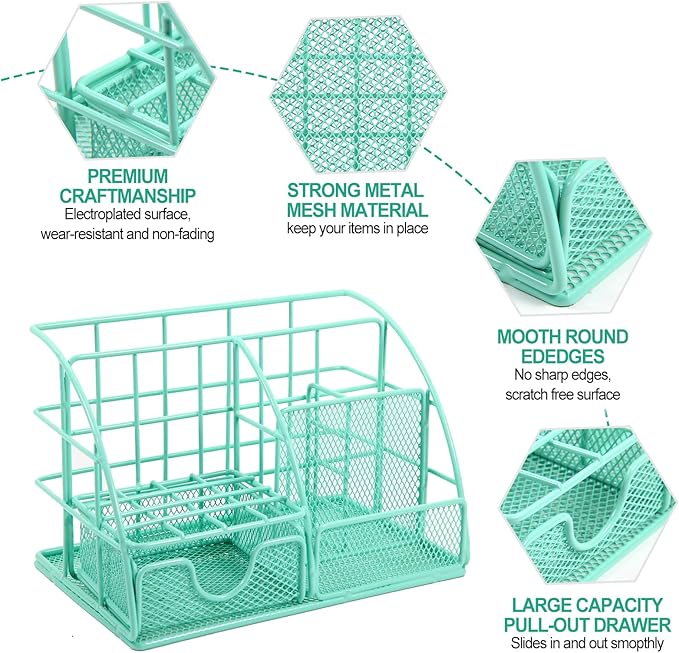 JUOPIEA Desk Organizers and Accessories Office Supplies Organizer with Pen Holder, 72 Clips Set and Phone Stand, Metal Mesh Desktop Organizers with Drawer for Home, Office, School Ect