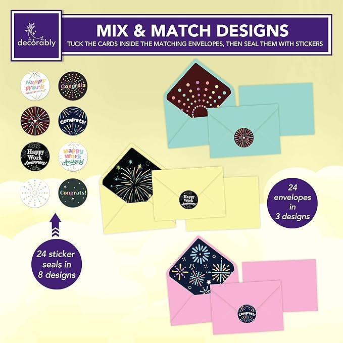 - MATCHING ENVELOPES & STICKERS - Mix and match the boxed work anniversary cards. Get 24 workaversary cards for work in 8 designs, 24 envelopes with pre-water soluble gum closure in 3 designs and printed inner lining, and 24 sticker seals in 8 designs.