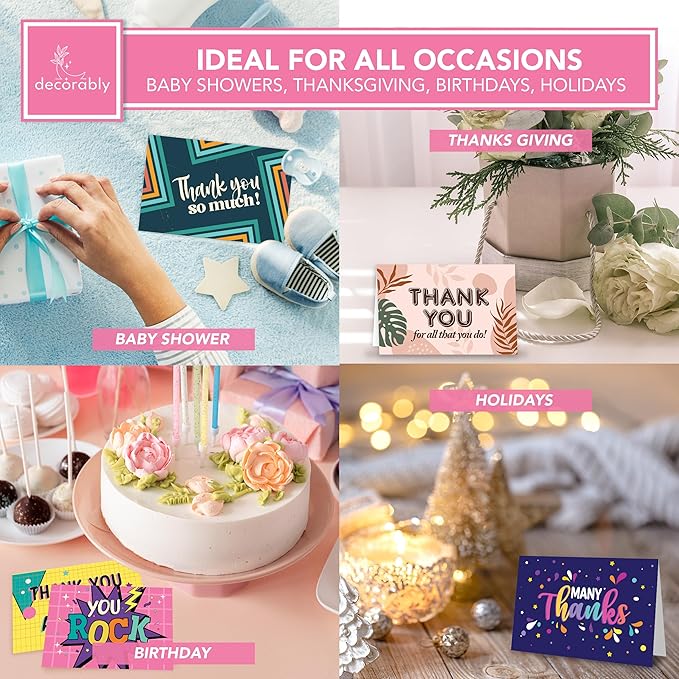 - IDEAL FOR ALL OCCASIONS - Spread joy and brighten someone’s day with these thank you cards with envelopes assorted! Ideal for all occasions, this versatile assortment ensures you have the ideal card to share heartfelt gratitude anytime, anywhere.