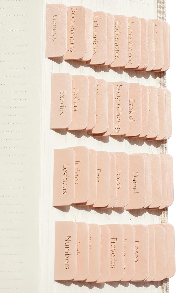 - Elevate your Bible study with Mr. Pen set of 75 Bible tabs, elegantly presented in light pink with shimmering metallic gold text! This set encompasses 39 Old Testament books, 27 New Testament books, and 9 customizable blank tabs, thoughtfully organized across 5 sheets.