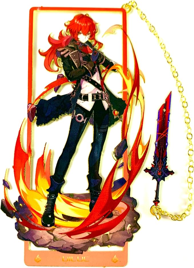 - These bookmarks feature a striking design inspired by Diluc, one of the iconic characters from Genshin Impact, showcasing his fiery temperament and powerful presence with intricate details