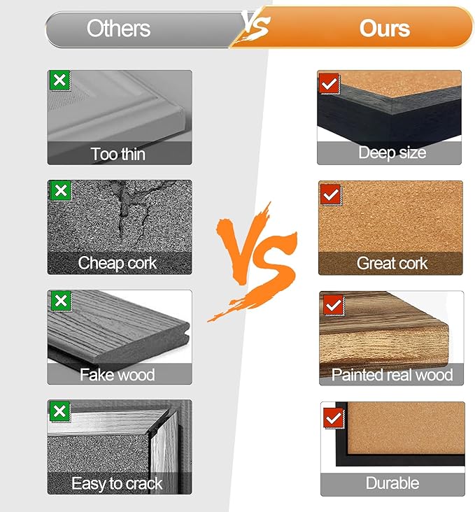 - Natural Cork Board - This bulletin board measures 23 x 18 inches and is crafted from top-notch, dense cork that withstands long-term use, without unsightly pinholes. Compatible with almost all thumbtacks, this reusable cork board for walls is a must-have and pleasing to the eye.