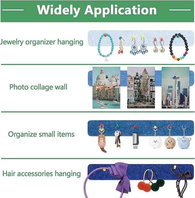 - 【Widely application】:Our 5 pack felt pin board bar strips can be used in different occasions to display pictures, notes, schedules, reminders ,what's more, you can also hang pendants like keys and necklaces.Feel free to use on the door, closet,refrigerator, bookcase, mirror, etc.