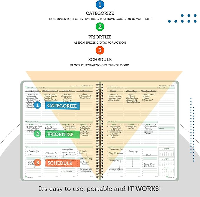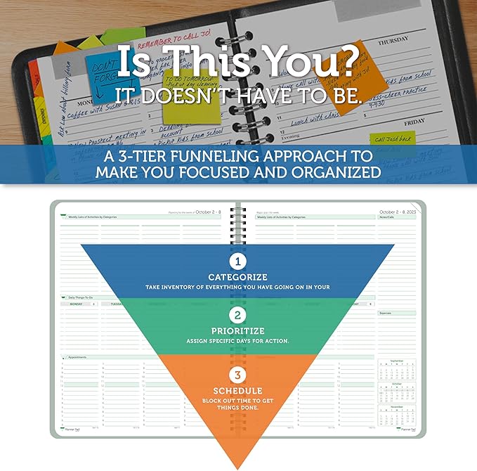 - EXCLUSIVE 3-TIER FUNNEL DOWN approach helps you prioritize and organize all that matters. Section 1- CATEGORIZE is to inventory everything you have going on. Section 2 - PRIORITIZE items from section 1 to specific days for attention. Section 3 - SCHEDULE is to block out time for tasks from section 3