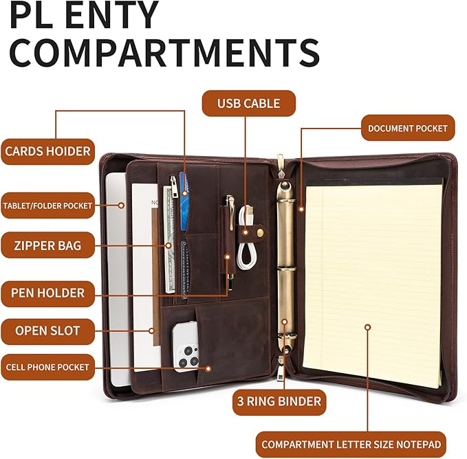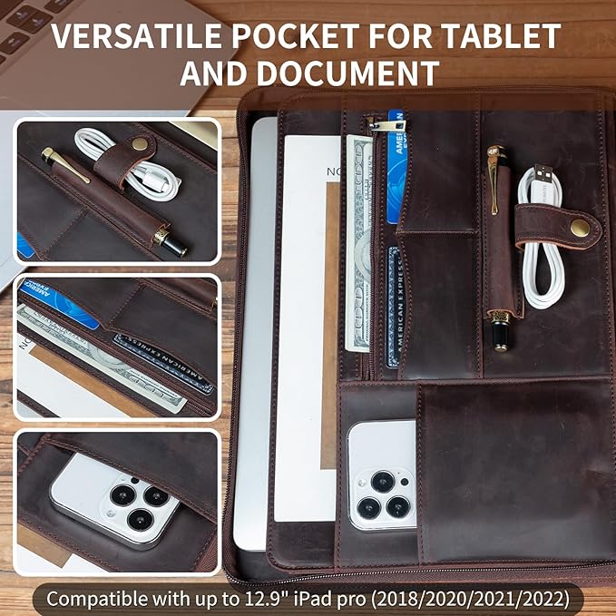- PREMIUM GENUINE LEATHER– Vintage crazy-horse cowhide leather, The scratches, wrinkles and fingerprints left during use will make your folio more and more retro. Process:Handmade. Accessories:Double YKK zippers, for great safety and ultimate organization.