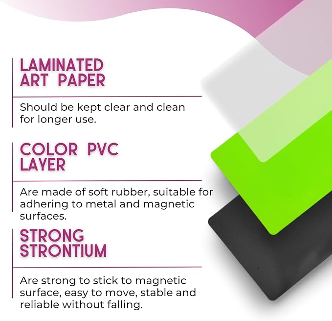 - High-quality Material: The magnetic dry-erase labels have a white writable front with a colored edge, made of laminated art paper, dry-erasable, and a 0.04 inches thickness strontium magnet, on the back for a powerful adhesion to various surfaces; Each label measures 5 x 3 inches;