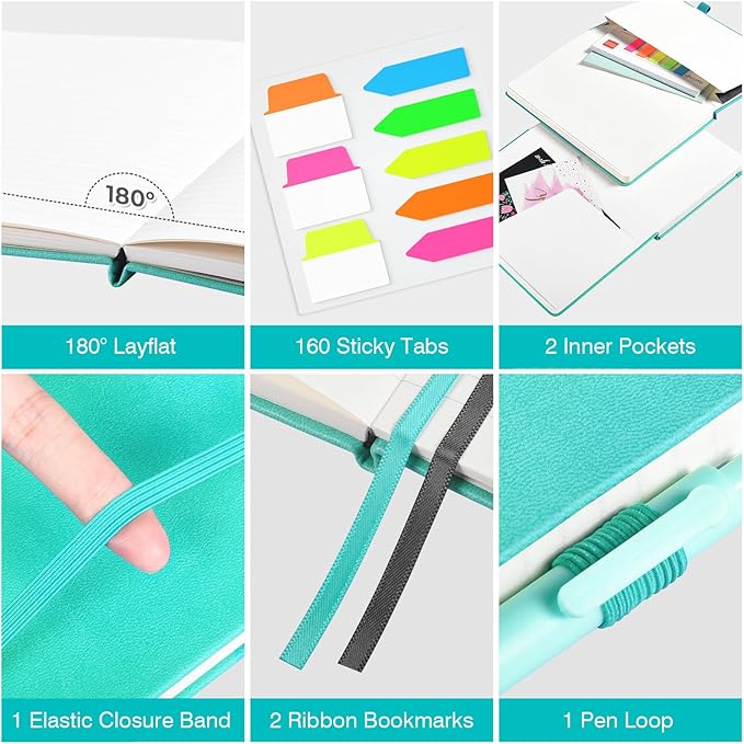 - 【Thoughtful Accessories】Our hard cover notebook comes with a range of practical accessories to enhance your writing experience. Each notebook includes 2 pockets, 2 bookmark ribbons, 1 elastic band, 1 pen loop. And as a bonus, each set of notebooks comes with 3 pens that match the color of the notebooks, along with 160 PCS colorful index & tabs stickers.