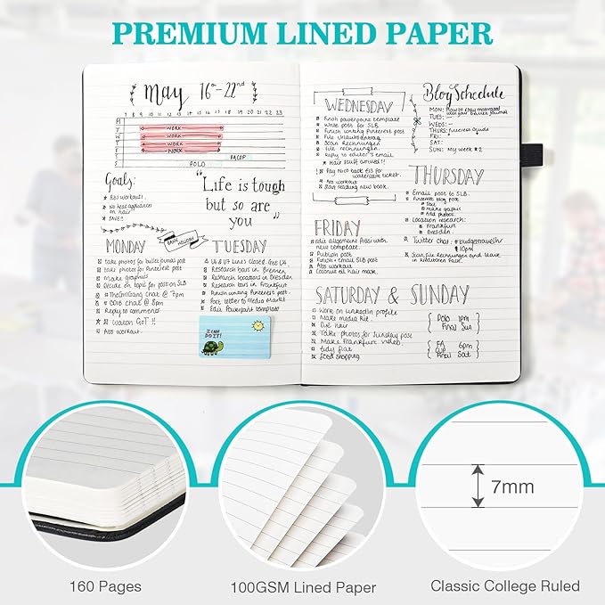 - 【Premium Writing Experience】These lined journals boast 100GSM paper with 80 sheets (160 pages). The paper is compatible with a wide range of pens, ensuring a seamless writing performance without any ink bleed-through. The 7mm line spacing is suitable for most people's writing preferences. Additionally, the pages can lay flat at 180°, allowing for easy note-taking. Ideal for school, office, outdoor activities, and travel.