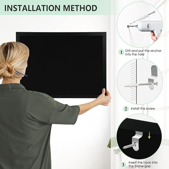- [Package Include] 24''x 18'' Black bulletin board with linen, 10 pushpins, and 10 clips. Installation hardware is all provided. The hanging hook can be easily installed on any frame.