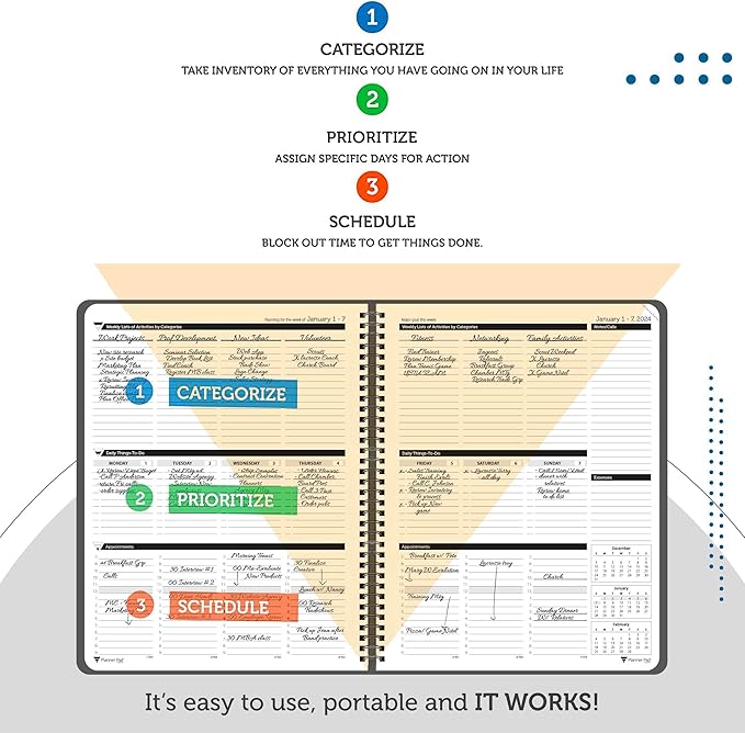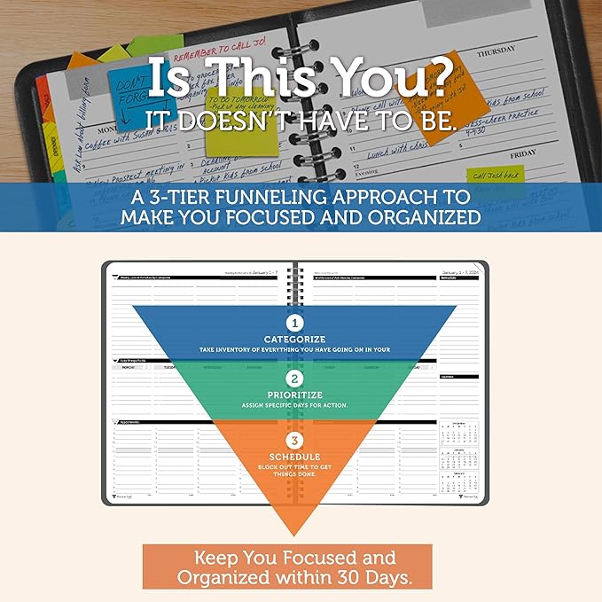 - EXCLUSIVE 3-TIER FUNNEL DOWN approach helps you prioritize and organize all that matters. Section 1- CATEGORIZE is to inventory everything you have going on. Section 2 - PRIORITIZE items from section 1 to specific days for attention. Section 3 - SCHEDULE is to block out time for tasks from section 2