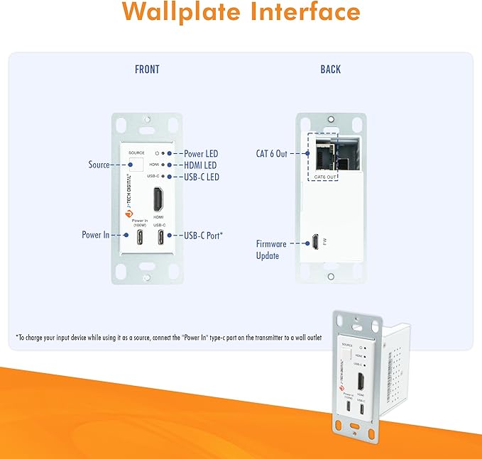 - ๐๐๐๐ / ๐๐๐-๐ ๐๐ง๐ฉ๐ฎ๐ญ๐ฌ & ๐๐๐-๐ ๐๐ก๐๐ซ๐ ๐ข๐ง๐ ๐๐จ๐ซ๐ญ โ Features HDMI and USB-C input ports for flexible device connectivity. The USB-C input port also charges your connected source device so that you donโt have to worry about running out of battery! (Note: To charge your USB-C input device while using it as a source, connect the โPower Inโ USB-C port on the transmitter to a wall outlet).