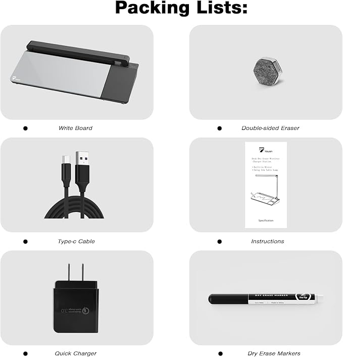 - Overall, the TOWON Whiteboard for Desk is a sleek and efficient accessory that combines a dark gray dry erase board, a fast charger charging station, an adjustable foldable desk lamp, and a dry erase computer desk notepad. It caters to busy professionals, students, or anyone seeking an organized and productive workspace in the comfort of their home or office