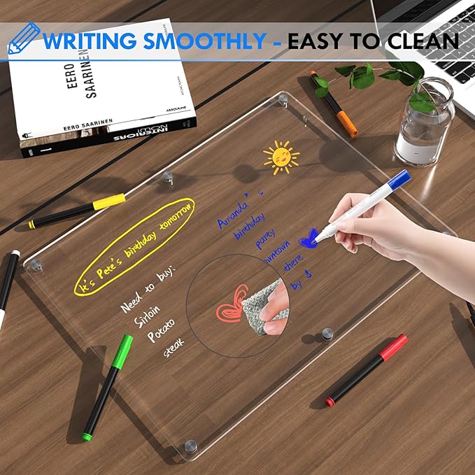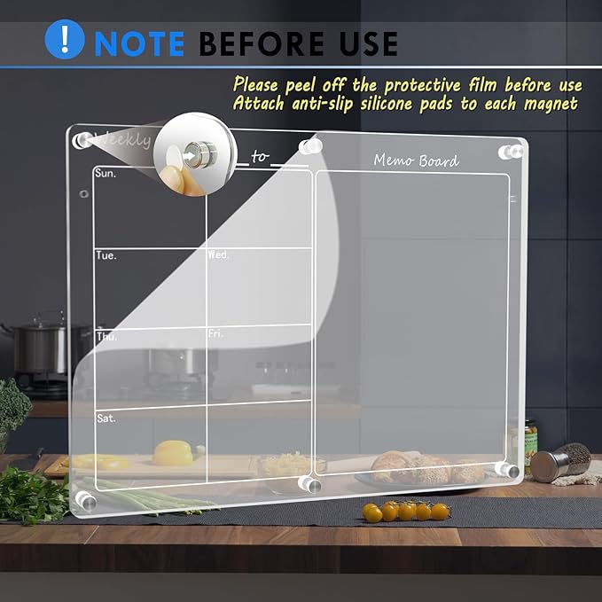 - 【4 Stronger Magnets-No drilling, Never Slide Down】4 pcs strong 0.12 in extra-thick detachable magnets and the Nano silicone anti-slip pads included in the package enable the magnetic fridge calendar to stick firmly to metal surfaces and most refrigerators.This erasable acrylic board will never slide down or scratch your refrigerator (Magnetic function is not suitable for stainless steel surfaces)