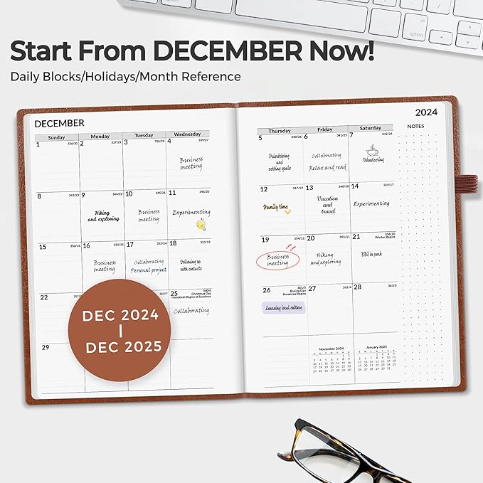 - Monthly View - Each date box provides ample writing space and includes the previous and next month's reference, ruled daily blocks with popular holidays, and Julian Dates for easy long-term project and appointment scheduling. 2 ribbon bookmarks and bonus monthly stickers for easy navigation and finding.