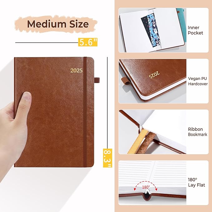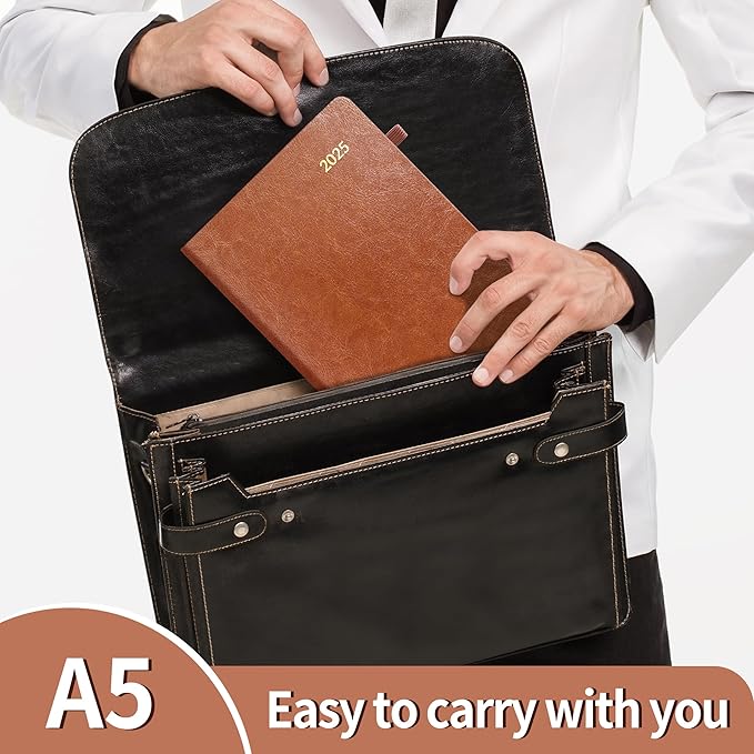 SUNEE 2025 Weekly & Monthly Hardcover Planner 5.5" x 8.3" - 12 Month (January 2025 - December 2025), Small Hardcover Planner, Pocket, Notes, 100 GSM Paper, Brown