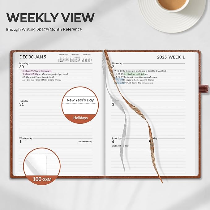 - Weekly View - 2-page weekly spread from Monday to Sunday provides generous lined writing space along with popular holidays and month reference previews, allowing for easy appointment, note, and daily task management.
