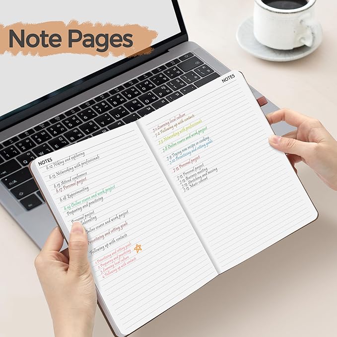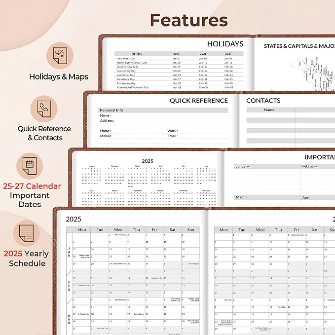 - Additional Features - The weekly planner includes 2025-2027 calendars, holiday lists, contact pages, notes pages, important dates, and US time zone map.