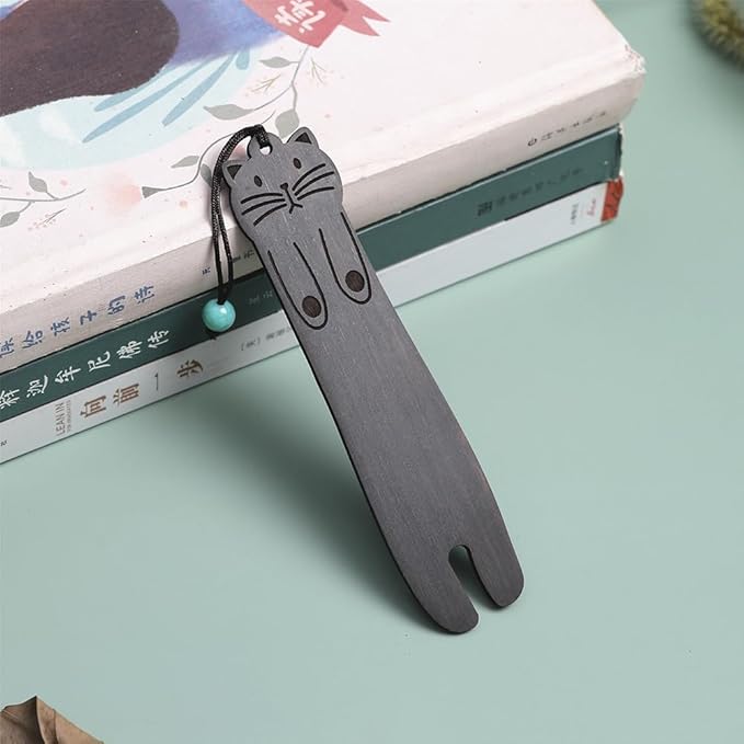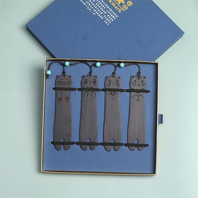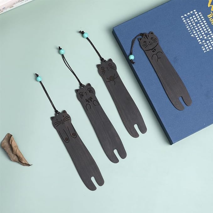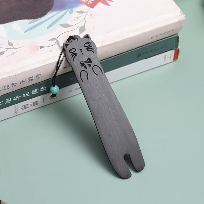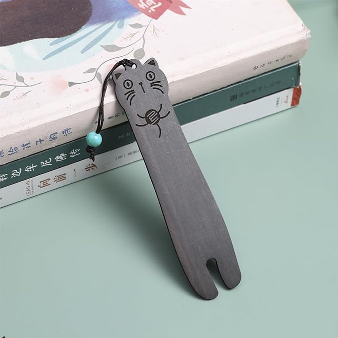 - 🐱This cute cat bookmark we use Black Sandalwood, Boxwood, Nanmu, Acid Redwood four different colors of natural wood as raw materials,Allergen and various dye free,laser engraved, and hand polished can keep your hands free from injuries, double quality check can keep your book away from bad mood.