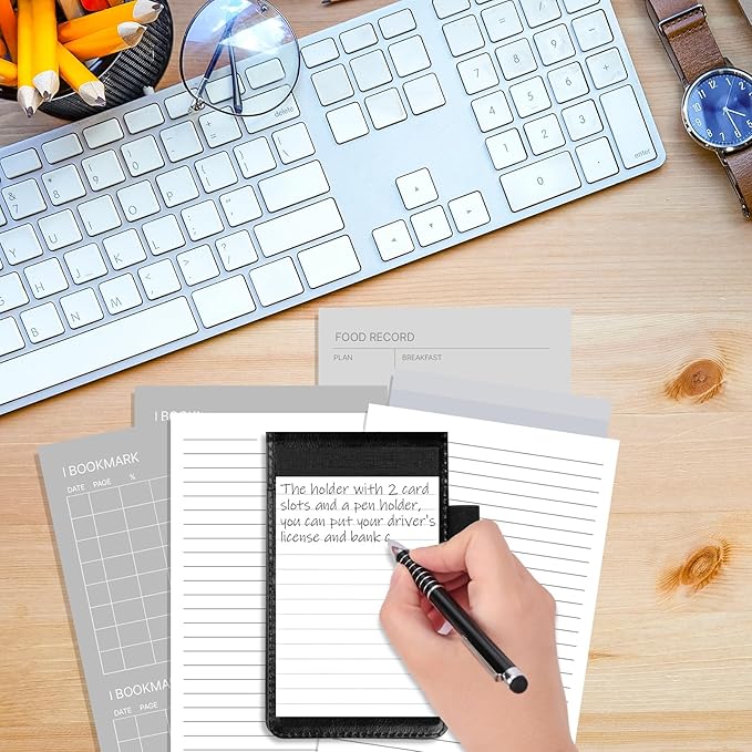 - Super Value Pack - This package includes a mini pocket notepad holder with 50 lined sheets, a durable metal pen, and 9 memo book refills, each containing 30 lined sheets. The ruled pages offer comfortable writing space, making it perfect for various occasions such as business meetings, conferences, office work, and travel.