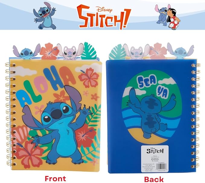 - STITCH NOTEBOOK - Features Stitch on the front cover, lined pages with color images of Stitch on the corners, 4 color illustrated section dividers, and tab dividers.