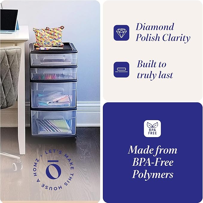 Homz Plastic 4 Clear Drawer Medium Home Organization Storage Container Tower with 2 Large Drawers and 2 Small Drawers, Black Frame (2 Pack)