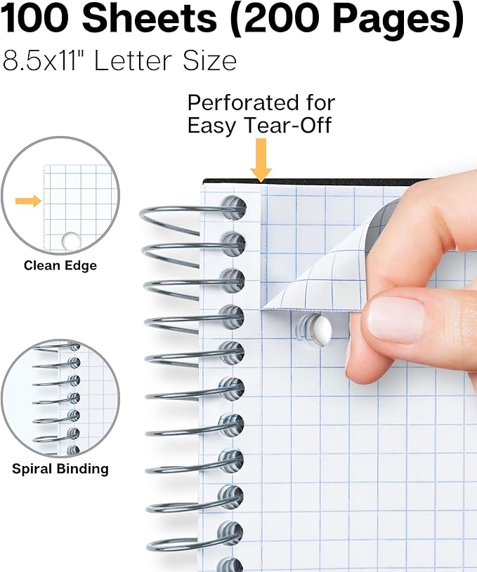 - 100 Double-sided 8.5 x 11 Sheets. Graph paper ruled with ¼” squares, 4 per inch. Perforated for clean edge tear-out. Detached page measures 8-1/2 x 11", 3-Hole punched to fit standard binders.