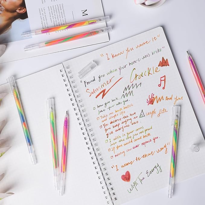 - Magical rainbow Link-12 pcs rainbow gel pens, including 12pcs glitter with 6 color combination.These pens can write with different colors.Each pen color is a mixture of three colors.Turn ordinary diaries or notes into gorgeous ones with amazing spiraling colored rainbow.This will very cool!