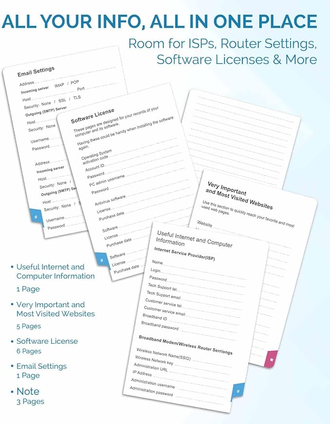 - More Pages, More Entries - This password notebook features 115 sheets of thick 100gsm paper, capable of storing up to 851 passwords—almost twice the capacity of others on the market. It also includes ample space for internet service providers, wireless router settings, software licenses, email settings, frequently visited websites, and additional notes.