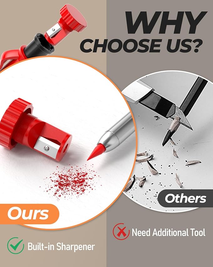 - Carpenter Pencils with Sharpener: The sharpener is screwed into the top of the work pencil, which won't get lost either and your mechanical carpenter pencil will be sharpened for nice precision