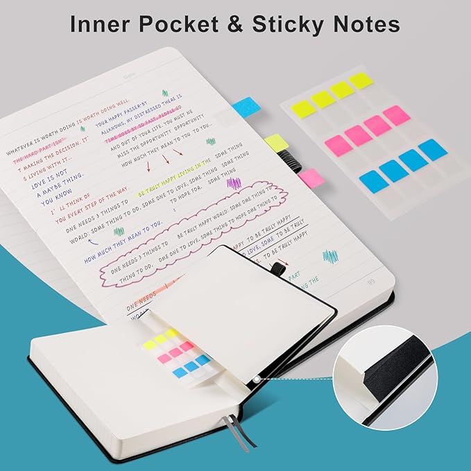 - HUMANIZED DESIGN: 3 Contents Pages to log more entries. No more worrying about not having enough index pages; 2 Exquisite ribbon bookmarks to help you find content faster; 1 Elastic closure band to keep your pages safe; 1 pen holder to make your pen no longer alone; 1 Back Inner pocket for stashing notes, small gadgets, etc; Rounded corner design makes the lined notebook not easy to be damaged and curled