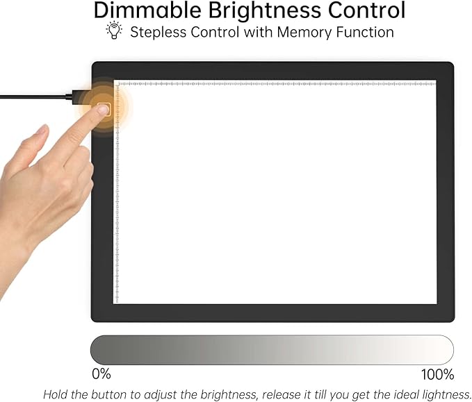 - Stepless Brightness Control with Smart Memory Feature: Touch the switch once to turn on/off the light box. Then hold the press of the switch to adjust the brightness, the brightness will change continually (bright to dark, dark to bright), and release it till you get the ideal brightness. This light pad can smartly memorise the last brightness