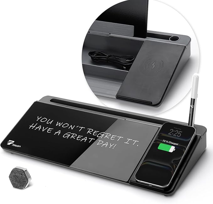 - TOWON Desktop Glass Whiteboard with Charging Station is a versatile and innovative desk accessory designed to enhance productivity and organization while keeping your devices charged