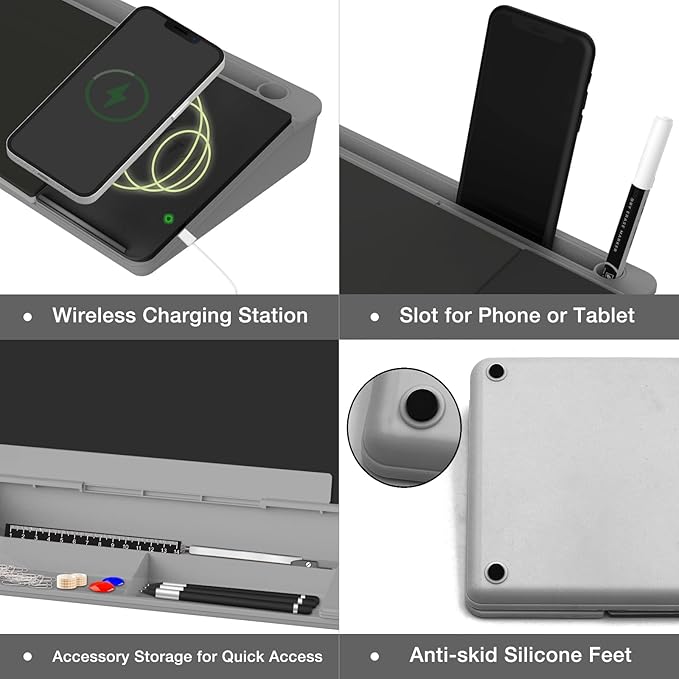 - The combination of a whiteboard, wireless charger station, and storage compartments, makes this product a true desktop Whiteboard, streamlining your workspace and offering a range of features to boost productivity and efficiency