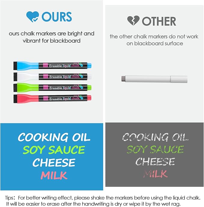 - Cost-effective Sets: Package include: 4*liquid chalk markers, 1*rag and 1*16''x 12'' black dry erase board. Ideal complete set for home, office, or classroom. The colors of the chalk markers are super bright and look great up against the black magnet board sheet, which is easier to read, please follow the instruction for chalk markers before use.