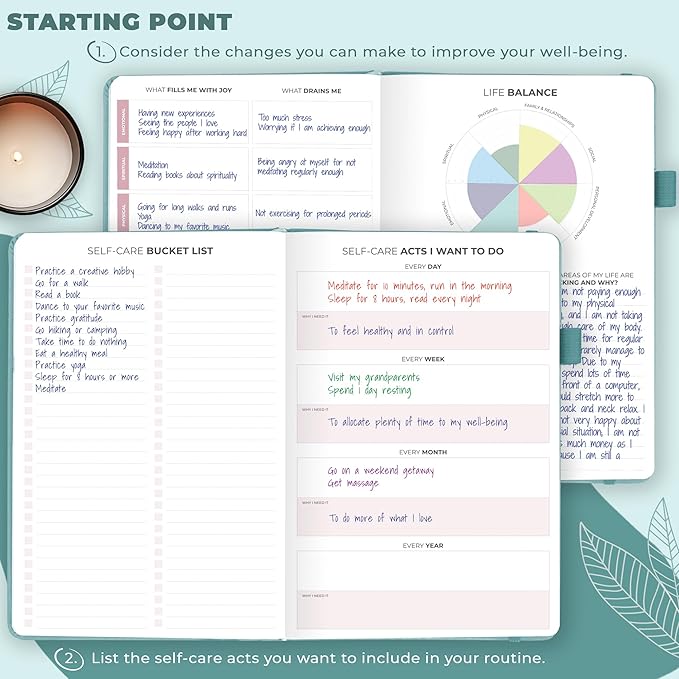 - BUILD A HAPPIER & HEALTHIER MINDSET FOR YEARS TO COME: This self care notebook is filled with prompts, open-ended questions, wellness trackers, and many other tools to help you pinpoint the changes you can make to improve your well-being.