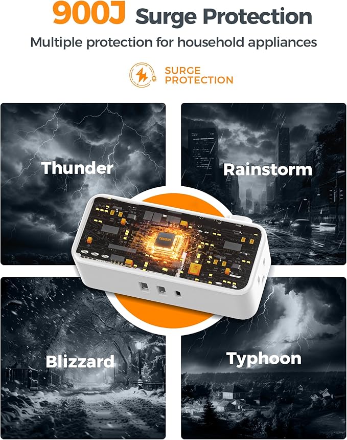 - 900J Surge Protector Outlet: Power strips with surge protection are equipped with short-circuit protection and over-current protection. This flat outlet extension cord can protect your electrical appliances from lighting, surges and spikes