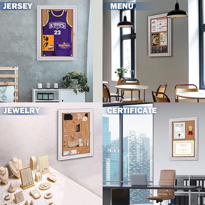 - 💧OUTDOOR USE —The weather-resistant cabinet construction features an aluminum frame with a smooth surface and full-length piano hinges that add strength and durability to the door frame. Drain holes on the bottom and a sealed backing mean you can mount the board outdoors.