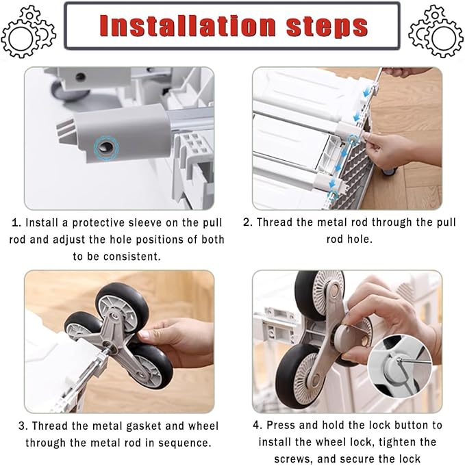 - The folding shopping cart with wheels is equipped with 2 detachable 360°rotating noiseless wheels and 2 detachable Climbing wheel sets that are composed of 3 wheels each.The wheels can be removed and replaced in a very simple way. Besides, the trolley has a cover to ensure the safety of items and to prevent rain drops when it rains.