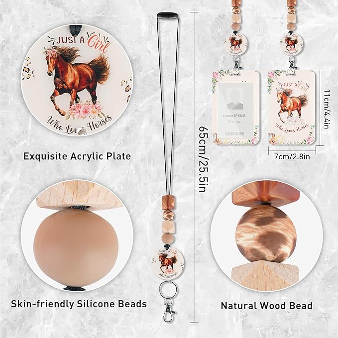 - Fashionable Badge Accessories: Elevate your style with the Just A Girl Who Loves Horses ID badge holder with lanyard. Its elegant design is complemented by 4 skin-friendly silicone beads, 3 natural wood bead, and a graceful acrylic plate, adding a fashionable touch to your attire